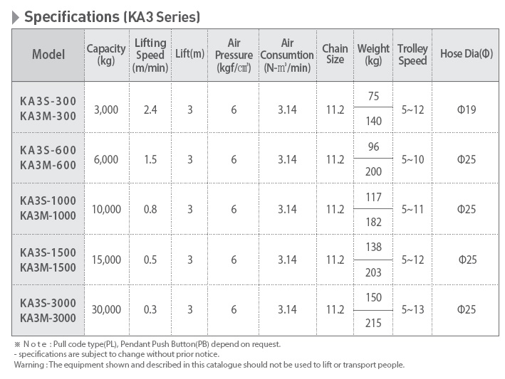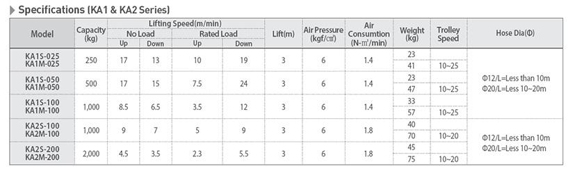 (1)氣動葫蘆:分為KA-S固定式氣動葫蘆、KA-M運行式氣動葫蘆兩種;